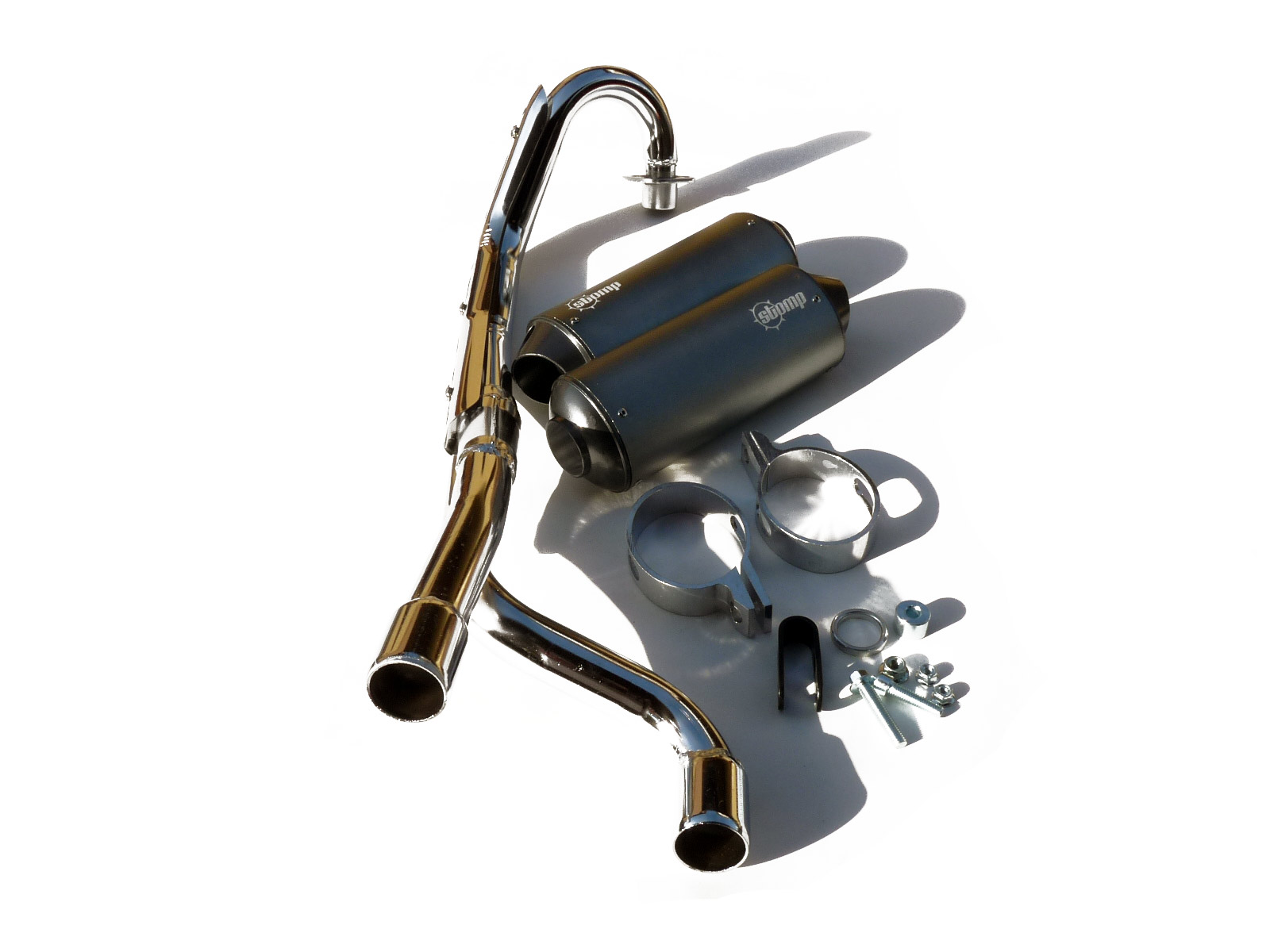 originální pitbike Stomp, DemonX, WPB; kompletní výfuk CRF70 s dvojitou koncovkou, průměr do motoru 32 mm, do koncovek 38 mm, v sadě svod, 2x koncovka ,2x objímka, 1x výfukové těsnění, 2x úchytky k rámu